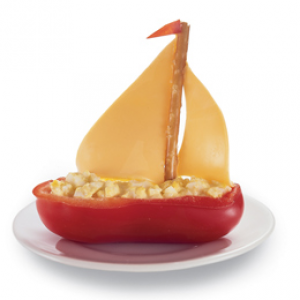 2. Fill each pepper boat with lunchtime cargo, such as tuna or egg salad. Sink a thin pretzel stick mast into the center of the boat, then add two triangular pieces of cheese for sails.